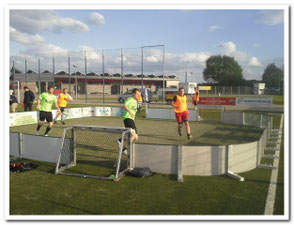 Hier wird den Kindern auch im 2 gegen 2 freies Spielen ermöglicht. Ein möglichst kleines Regelwerk (Bandenelemente nicht anfassen, den Ball an den Banden nicht einklemmen, die Hände bleiben frei und fair play) ist den Kindern als Vorgabe gegeben!