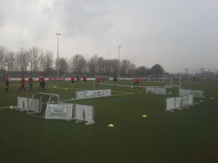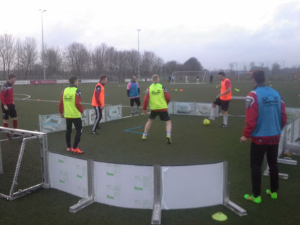 trainieren wir mit C-Junioren neben dem Strafraum zwischen einem normalen Tor auf der Toraus-Linie und der Bandenwand mit zwei Kleintoren auf Höhe der Strafraumlinie im 5 gegen 5 !